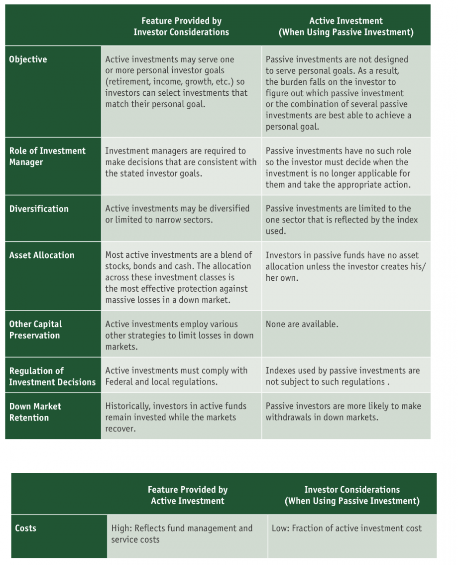 As this analysis shows, there a number of factors to be considered in choosing between an active and passive investment. The single issue investor (“all I care about is the return”) is advised to take careful note of the fact that past returns are no reflection of future results and that important services and protections may outweigh the cost savings if these features are discarded.