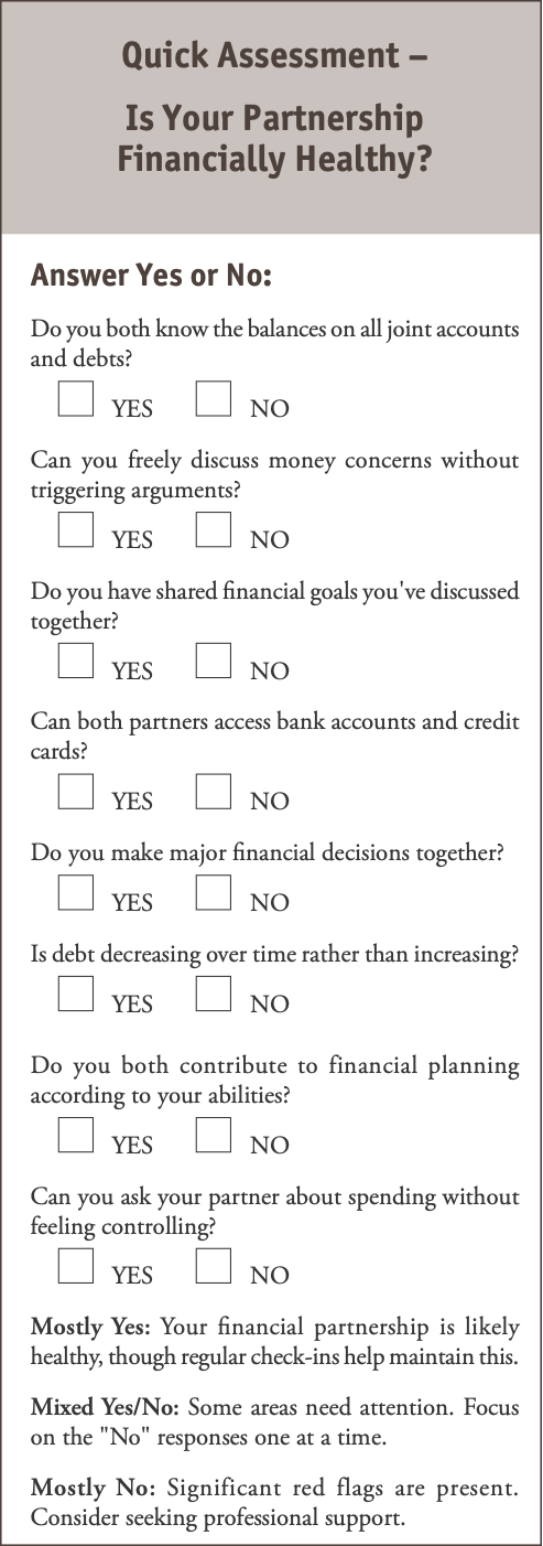 These comments alone don't signal a crisis. But if basic questions about money always seem to hit a wall—if you never see statements or know what's on the credit cards—you have a problem. Secrecy usually stems from shame, fear of conflict, or a desire for control. None of these creates a healthy foundation for joint decisions.