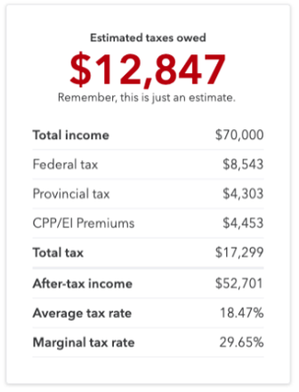 With a salary of $70,000 without an RRSP contribution, this is what the estimated taxes look like: (Source: Intuit Tax Calculator)